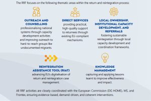 The RRF also contributes directly to the EU Strategy on Voluntary Return and Reintegration, promoting harmonised, rights-based, and results-oriented approaches across the European Union.